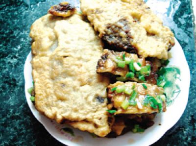 陈小姐拿出一块正四方形的芙蓉酥说,其实刚出锅的芙蓉酥应该是这样的形状。记者仔细端详,芙蓉酥大概分两层,上层是油炸过的面粉皮,色泽金黄,大概有0.5厘米厚;下层是混合有剁碎了的木耳、芋头、干笋的碎肉馅,炸过后有些焦黄,看上去十分可口。陈小姐介绍芙蓉酥的做法:首先面皮得用生鸡蛋来搅拌和面,蛋越多,面皮越好吃;其次碎肉馅用料也有讲究,不仅要选用半肥瘦猪肉,还要添加木耳、芋头、干笋等,这样口感才香脆;将面皮摊上砧板后,就将做好的肉馅铺在面皮上,接着用刀开始不停地剁,把肉馅均匀“镶”到面皮里。这道工序很重要,它能使接下来将芙蓉酥放到油锅里油炸时才不会散开。当芙蓉酥炸成金黄色之后即可捞起,再切成一块块的正四方形,即可待食。陈小姐说,芙蓉酥可以做好后马上食用,也可以存放时间较长而不变质。想吃的时候只要拿到锅里蒸软就可以了,咸香可口,让人吃了还想再吃。