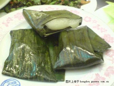 蕉叶糍,对于北方的朋友,可能比较陌生,但是对老南宁来说,蕉叶糍尤其亲切。蕉叶糍是壮家民间风味小食。将糯米淘净,浸泡后磨成米浆,装入布袋,压干水分。将洗净烫软的芭蕉叶剪成六寸左右的方块,涂生油以防粘连,将干米浆用蕉叶包好煮熟。名曰蕉叶糍。要吃甜的,将糖煮成浓糖浆,加适量猪油,与干米浆搓匀,拌以白糖、芝麻、碎花生仁为馅,包成长条形,入蒸笼中蒸20分钟即可食。喜吃咸的,则在干米浆中加适量盐,或用甜皮包咸馅。吃起来除了有一般糍粑的风味外,还有蕉叶的清香。