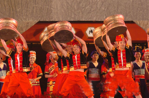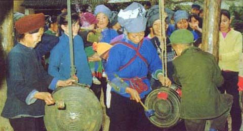 届时,各村的小伙子组成铜鼓队,把铜鼓抬到村附近的高山顶上,悬于木架,首先击鼓祭祖,然后进行击铜鼓比赛。其法是大鼓对大鼓,小鼓对小鼓,以四面为1组,每鼓3人,轮换着打,不能中断。以打得响亮动听、节奏明快、耐力持久为胜。比赛往往通宵达旦。同时,男女青年结伴纵声对歌。比赛结束,人们以从家里带来的粽粑等食物进行野餐,欢歌笑语响彻山谷。