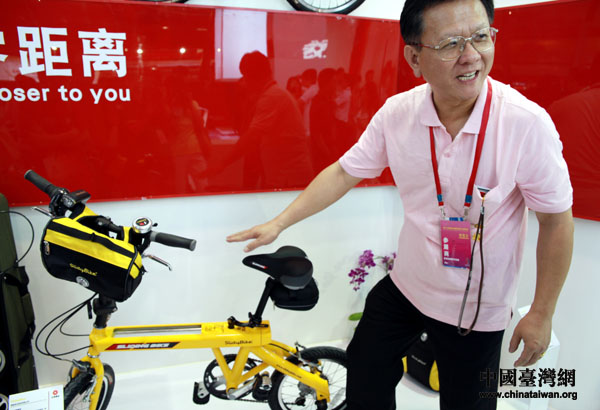 澎铼实业股份有限公司的黄中庸总经理向民众介绍公司产品——伸缩型单车。(中国台湾网 钟宝华 摄)