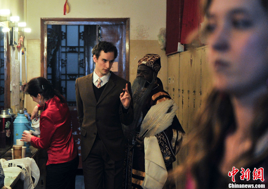 2月13日,首届外国人闹元宵中华才艺大联欢在北京老舍茶馆举行,外国演员们在后台准备节目。中新社记者 廖攀 摄