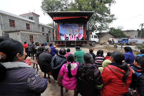 2月14日,江西省泰和县南圳村村民在家门口看演出。 当日,为迎接元宵节,江西省泰和县采茶剧团的演员为乡亲们送上了一场具有地方特色的采茶舞戏。新华社记者 何俊昌 摄