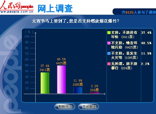 截至14日22时,共有9125人次参与了调查,选择“不支持”的网友超过了六成。其中,48.5%的网友(4425票)选择“不支持。噪音环境污染”;11.9%的网友(1085票)持“不支持”态度,是因为“易发生火灾等”。选择“支持。不放没有年味”选项的网友只占到了37.4%(3411票)认为。此外,还有2.2%的网友(204票)认为“无所谓。放不放都行”。