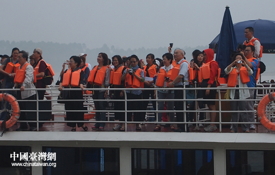 13日,情系巴蜀两岸文化联谊行参访乐山大佛。图为台湾嘉宾在游船上观赏大佛全貌。(中国台湾网 张瑞宸 摄)