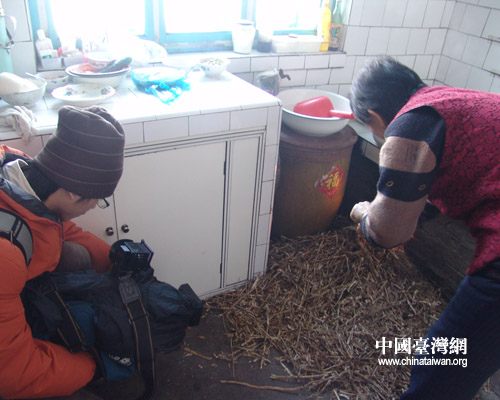 一走进王庆荣家的小院,记者们立刻被堆的比人还高的玉米垛所吸引,完全不顾室外的低温,纷纷合影留念。走入屋内,看到正在包饺子的王家大婶,台湾记者纷纷询问东北饺子的制作过程,并向大家介绍在台湾过年包饺子的风俗。有记者风趣的问到,在当地娶媳妇是不是一定要娶会包饺子的。