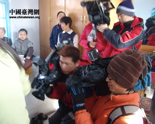 记者到达时,王庆荣一家人正在吃午饭。台湾年代电视台的记者陈立国经不住火炕的温暖,地道的东北农家菜的吸引,爬上火炕与大家坐到一起。记者们对东北大馅饺子美味赞叹不已,台湾“中央社”记者周慧盈一边招呼大家都来尝尝,一边赞叹“怎么这么好吃啊,真想一直吃下去!”。
