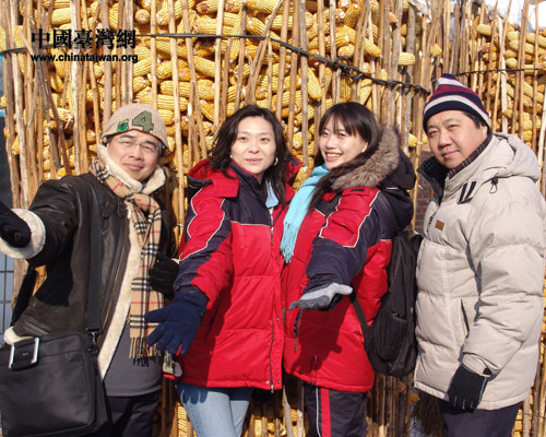 采访第二天,两岸媒体人走进满族乡宝山村农家院。玉米堆前合张影,红红火火又一年