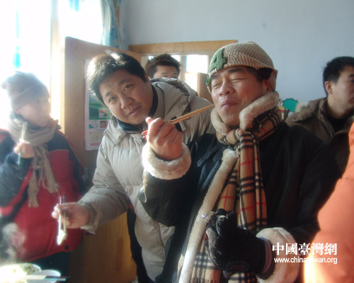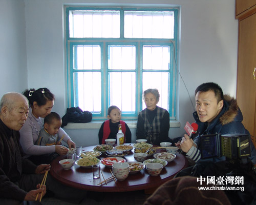 记者们到达时,王庆荣一家人正在吃午饭。台湾年代电视台的记者陈立国经不住火炕的温暖,地道的东北农家菜的吸引,爬上火炕与大家坐到一起。