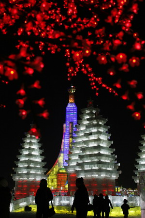 1月5日,游客在夜色中观赏冰雕。当日,第24届中国?哈尔滨国际冰雪节正式开幕,本届冰雪节主题是“冰雪奥运”,包括冰雪艺术、冰雪体育、冰雪文化、冰雪经贸、冰雪旅游等5大板块,历时2个多月,将举办100多项活动。新华社记者 高增双 摄