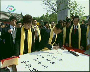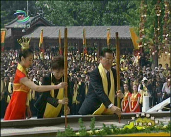 连战一行于4月16日下午抵达郑州,18日晚出席了丁亥年黄帝故里拜祖大典欢迎晚宴并欣赏拜祖大典音乐会。今天,连战夫妇在中共中央台办主任陈云林的陪同下入场,并为大典题字。大典开始后,佩戴黄帝丝巾的连战夫妇齐步趋前,恭敬地向黄帝像敬献花篮,并净手点火上香,鞠躬参拜。