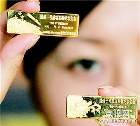 “嫦娥一号”胜利升空,24日下午,限量发行2007套的“嫦娥金条”正式上市。具有唯一限量编号的每套“嫦娥一号”纪念金条含两根25克AU9999金条。第一根金条精雕象征中华民族的万里长城、五星红旗和“嫦娥一号”在太空飞行的姿态;第二根金条雕刻有嫦娥奔月的传统神话图案,寓意国人千年的梦想开始变成现实。金条背面雕刻的是“嫦娥一号”在太空的运行图。中国国家博物馆艺术品开发中心监制了这套“嫦娥一号”纪念金条。记者阎彤摄