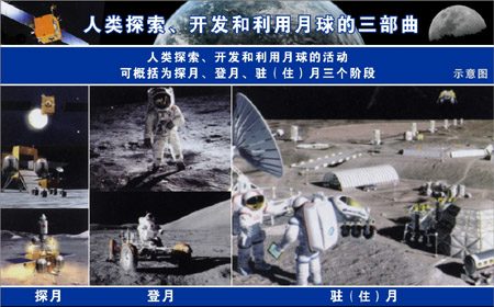 中国的月球探测发展战略包括“探”、“登”、“驻”三大阶段,也就是不载人探月阶段、载人登月阶段和建立月球基地、进驻月球基地进行研究开发阶段。目前开展的探月工程,包括“嫦娥一号”的发射,属于“探”的阶段。
