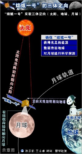 同时,卫星为了保持足够的能源能够绕月飞行,卫星的太阳翼要对日进行定向。最后,为了将科学仪器探测出的数据传回地球,卫星上的定向天线要实现对地球的定向。保持卫星的三体定向,是我们在后续工作中需要关注的第二个环节。