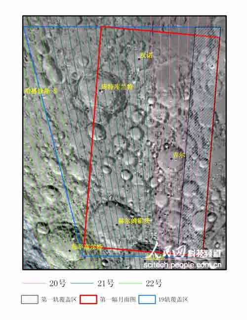 4) 19轨数据图像的镶嵌:由于第一幅图区域位于中高纬度区,相邻轨道数据重叠率较高,对于多次重叠的地区,选用图像质量相对较好的数据参与镶嵌,最终形成了第一幅月面图。