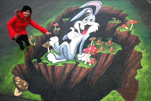 在南京玄武湖公园里,彩绘艺人在公园的主干道上创作的“兔八哥”三维立体彩绘受到了游人的喜爱,人们纷纷停下脚步,拍照留念。
