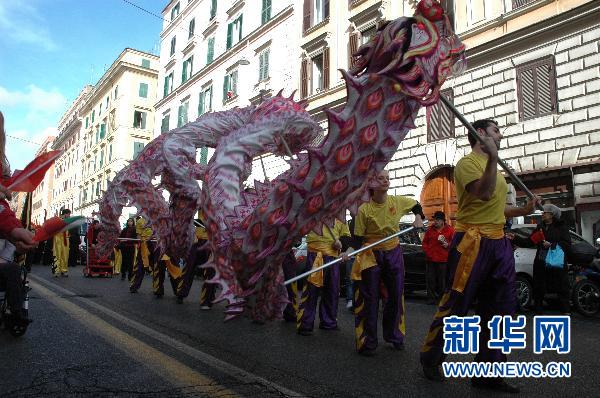 一支由意大利人组成的舞龙舞狮队17日沿着罗马华人聚集的维多里奥区各条街道进行巡回表演,与旅意华侨华人共庆元宵佳节。精彩的演出吸引了众多路人围观。新华社发(谢培康摄)
