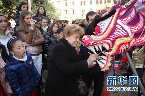 2月17日,意中友协主席曼契尼女士为舞龙点睛。一支由意大利人组成的舞龙舞狮队17日沿着罗马华人聚集的维多里奥区各条街道进行巡回表演,与旅意华侨华人共庆元宵佳节。精彩的演出吸引了众多路人围观。新华社发(谢培康摄)