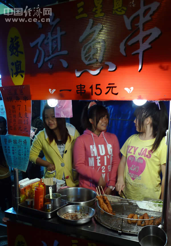 台湾宜兰罗东夜市,旗鱼串不是很贵,换成人民币也就3块多,小姑娘们看到我拍照十分羞涩的把头扭开了。
