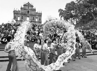 春节临近,又有许多内地游客计划赴港澳旅游,每年春节澳门标志性建筑“大三巴”前都会有传统的舞龙表演。 (资料图片)
