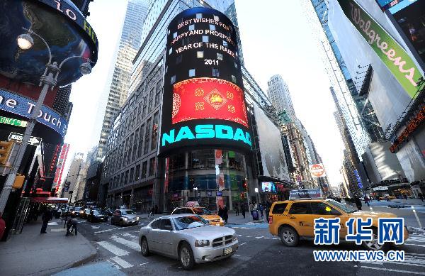 2月3日,在美国纽约,纳斯达克交易所的电子显示屏上打出“恭贺新春”的字样。美国纽约纳斯达克交易所当天举行祝贺中国2011年农历新年开市仪式,以这一方式共同庆祝中国的传统佳节。新华社记者申宏摄