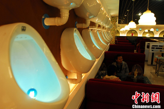 被称为“全世界最变态的主题餐厅”之一的台湾便所餐厅连锁店于新年伊始正式在昆明亮相,这家便所主题餐厅,将厕所和餐饮相结合,颠覆传统,幽默的设计理念更让人跌破眼镜。尿斗以壁灯的形式成墙上装饰,椅子是抽水马桶,桌子是洗手盆,连会员礼品区都摆上形状不同的便便,吸引了许多市民来尝鲜。