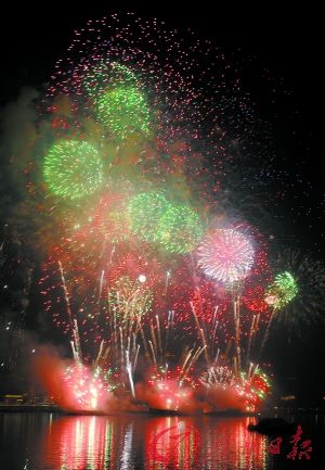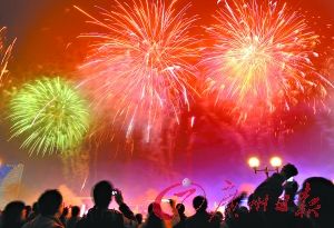 昨天晚上8时30分至9时20分,2011年广州春节焰火晚会在珠江白鹅潭江面主会场和琶洲江面分会场同时举行,18万枚烟花冲天直上,喜迎2011年新春的到来。瑰丽璀璨的烟花交相辉映,为广州市民奉献了一场难忘的节日盛宴。