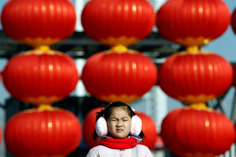 1月26日,北京,一个小姑娘站在节日气氛浓郁的街头。