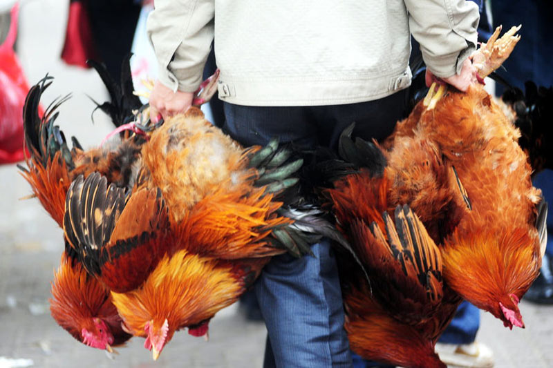 2月1日,海南琼海,有“无鸡不成”传统的琼海节前鸡市异常火爆,一位市民一次购买数只阉鸡。