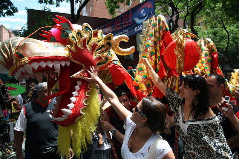 当地时间1月30日,在阿根廷首都布宜诺斯艾利斯“中国城”举办的庙会上,当地民众触摸龙头。阿根廷华侨华人当天在布宜诺斯艾利斯的“中国城”举行春节庙会,庆祝中国农历新春佳节的到来。这是当地华人连续第五年举办春节庙会活动。
