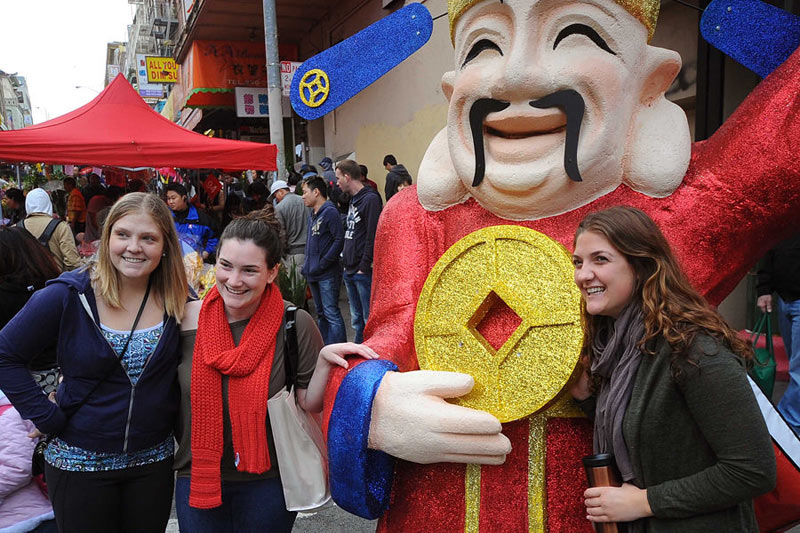 当地时间1月30日,在美国旧金山唐人街举行的年宵花市上,几个美国姑娘和中国财神合影。为期两天的旧金山年宵花市于当天结束。当地民众和游客在花市上不仅可以选购年货,还可以观赏文艺表演。年宵花市拉开了旧金山农历新年一系列庆祝活动的序幕。