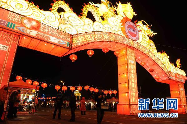 2月14日晚,参加“万家乐”元宵文化节开幕式的市民走过花灯龙门。当日,为期五天的2011年“万家乐”元宵文化节在内蒙古草原新城鄂尔多斯市东胜区拉开帷幕。 新华社记者张领摄