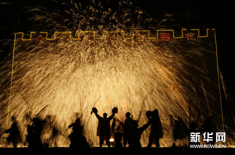 2月16日,在河北省蔚县暖泉镇,民间艺人向古城堡上泼洒铁水,表演“打树花”。新华社记者 任正来 摄