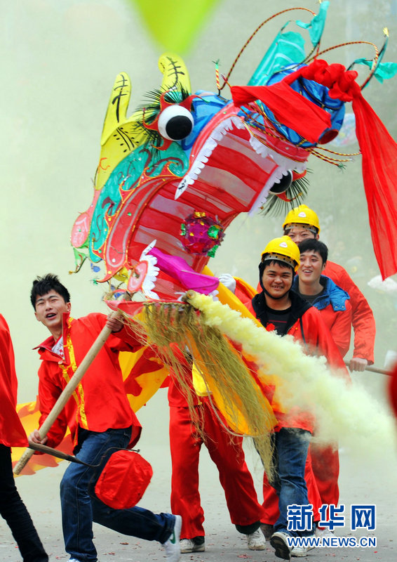 2月16日,德江县街头,一支舞龙队伍在表演。当日,贵州省德江县的10万土家族群众走上街头舞龙灯、演傩戏、扭秧歌,喜迎元宵节。 新华社记者 刘续 摄