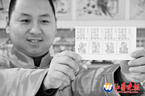 春节期间,山西省邮资票品局和广灵剪纸文化产业园区联合发行一套《瑞兔呈祥》剪纸邮票,其中3000多套出口东南亚国家,几天内被抢购一空。图为一位剪纸艺术家正在展示《瑞兔呈祥》邮票。