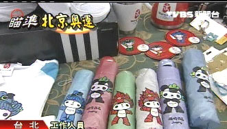 另外,以奥运福娃为主题的雨伞一把卖179元(新台币,下同),印有福娃图案的儿童帽一顶189元,奥运授权背包一个要价399元,而印有北京奥运图案的保温杯一个卖799元,还有授权的T恤一件新台币448元。