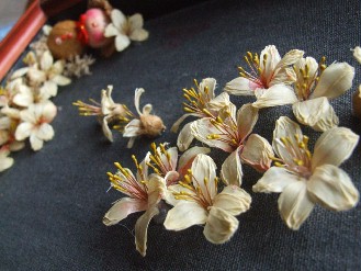 用柚子的种子皮做成的油桐花维妙维肖,乍看之下分不出真假。