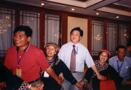 徐刚主任在琼台少数民族交流活动中,与台湾少数民族同胞一起载歌载舞。(资料照片)