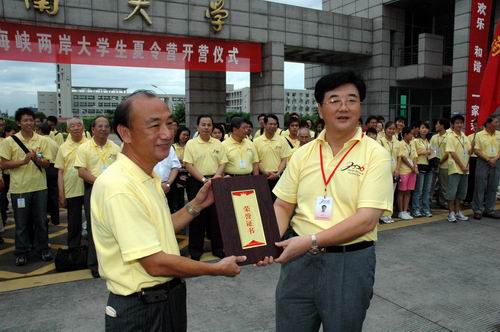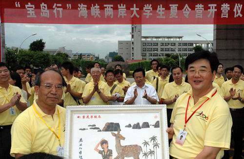 2006年7月,在2006“宝岛行”海峡两岸大学生夏令营开营仪式上,海南省台办主任徐刚向台湾南荣技术学院院长叶茂荣教授赠送纪念品。(图片来源:中国新闻网)