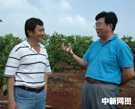 2006年10月,海南省台办徐刚主任(右)到定安县台资农场金德丰公司察看莲雾长势,左为台商黄益丰。(图片来源:中国新闻网)