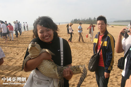 台湾学生“蛋蛋”勇敢地和鳄鱼合影