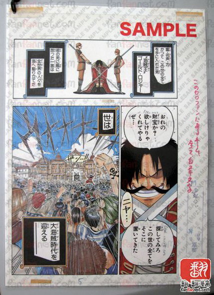 仔细研究了画的正反面,贴字痕迹和一边的印章以及批注之后,大家终于胆战心惊地确信了,这真的是一张尾田荣一郎亲手绘制的原稿。场景是第一话“冒险的序幕”的第一页,罗杰被处刑并留下让全世界趋之若鹜奔向“伟大航路”的告白的画面。