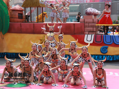 普达海文化创意彩车巡游,小学生扮演的小牛精神抖擞(中国台湾网 李丹 摄)