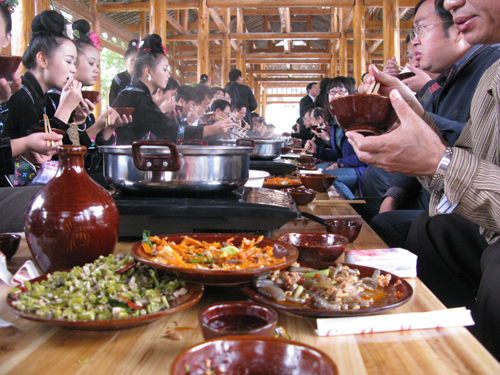 据当地苗人介绍,苗族的祖先是蚩尤,因为与屡败炎、黄二帝,迫使黄帝联合炎帝在涿鹿大战蚩尤,蚩尤战败身亡,部分苗人与炎黄部落联盟融合,部分苗人自上古时代从黄河流域一路南迁,直到19世纪才在湘、黔、滇一带定居下来。从历史渊源看,苗文化和汉文化同为中华文明的主流文化,共同的龙图腾表现的是苗、汉两个民族之间说不清道不明的血缘关系,在西江苗寨广场舞台中央硕大的龙纹图案向世人表明,苗族文化是极为正统的中华文明的又一瑰宝。