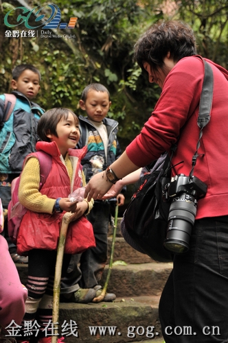 片刻的逗留之后,五个小孩柱着手中的拐杖,和众位网媒记者挥手道别,中国台湾网记者李丹还将随身的带的小毛绒玩具送给了可爱的小魏燕,孩子们又相互照应着走上了佛光岩下面的那条通道,那是他们回家的路。在那一瞬间,网记们纷纷按下了相机的快门,孩子们的背影以及他们手中的那根拐杖便被定格成永恒的画面,这些画面不仅能让人感受到孩子们上学的艰辛,更让人感动于孩子们对念书的执着与热爱。
