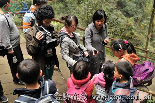 行走至佛光岩山脚下,网媒们看到了一幅生动有趣的画面:五个小学生背着书包、杵着拐杖,相互照顾着小心翼翼地爬台阶。在古老的丹霞园林里,这些灵动的小生命立即抓住了网记们的眼球,不时地对着“小精灵们”按动快门。