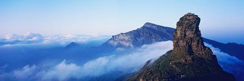 梵净山很奇特、险峻,尤其引人入胜的是新金顶,在海拔约2200余米的崇山峻岭上,突起一个山峰,像阳朔的丹霞一样,但是,只有一个,高约100米,如巨笋出土,常常红云环绕(哈苏6x6的片子有反映,另贴),直插苍宇,令人震撼。1618年,奉圣旨立碑曰:“众名岳之宗”,可见梵净山在皇帝眼里的位置了。