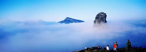 梵净山坐落贵州铜仁地区的江口、印江、松桃三县结合部,海拔不是太高(相对西部山峰而言),为2572米,是武陵山脉的主峰,也是贵州的第一高山。山峰上有两个金顶,北面的为老金顶,南面的为新金顶(后人为了便于称谓山上两个主峰,故此),本主题反映的是新金顶。