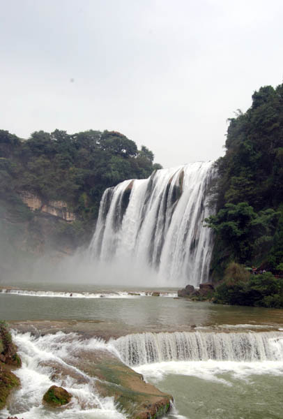 从安顺市区驱车30分钟,就来到了黄果树瀑布景区的大门口,入内步行约10多分钟,便来到了瀑布脚下。据说黄果树瀑布有几个特点,一个是上下左右前后都能看,这是世界唯一的;第二此外便是传言中的“只闻水声、不见瀑布”。第一个特点中,我们没有机会从瀑布的后面经过;第二点我们是清楚的感受到了,一路上“轰隆隆”的水声不绝于耳,这是水流从70多米的高空砸下的声音,但快到跟前,才看到了瀑布的真容。