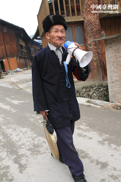 西江千户苗寨中年级最大的鸣锣响寨员,提醒大家千万要防火(中国台湾网 杨永青 摄)
