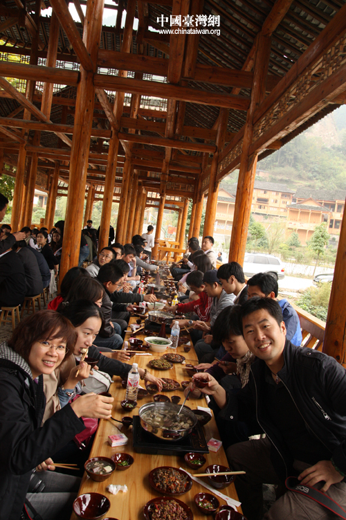 风水桥上吃长桌席,爽!(中国台湾网 杨永青 摄)